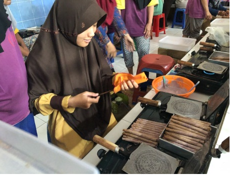 On the second day, the Culinary Adventures continued to Ndalem Katelan and Ngudi Rejeki Kelorida. Ndalem Katelan purple sweet potato and Shasa Egg Roll products are produced in Pleret, Bantul, Yogyakarta. While in this place, the students were invited by the owner to try making purple sweet potato egg rolls.