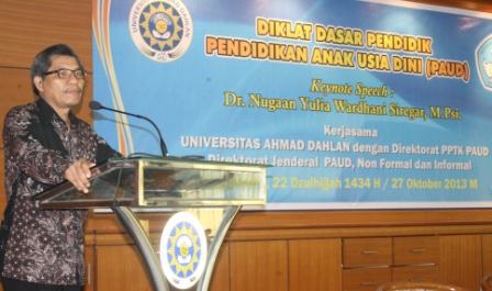 Dalam rangka peningkatan kualifikasi kompetensi Pendidikan Anak Usia Dini (PAUD), Universitas Ahmad Dahlan (UAD) bekerja sama dengan Direktorat Pembinaan Tenaga Pendidik dan Tenaga Kependidikan (PPTK) PAUD menyelenggarakan Diklat Dasar Pendidik PAUD. Diklat Dasar dibuka oleh Dr. Kasiyarno, M.Hum Rektor UAD. Acara yang berlangsung di Kampus I UAD Jalan Kapas 9 Yogyakarta Minggu (27/10/2013). hadir Keynote Speech Dr. Nugaan Yulia Wardhani Siregar, M.Psi Direktur PPTK PAUD Ditjen PAUD NI Kementerian Pendidikan dan Kebudayaan.