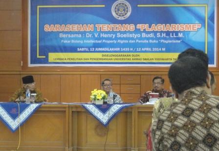 “Plagiarisme adalah pelanggaran etika, bukan pelanggaran hukum yang penegakannya berada dalam kewenangan akademik, bukan kompetensi pengadilan.” Papar Dr. V. Henry Soelistyo Budi, SH.,L.LM ketika mengisi acara Sarasehan tentang Plagiarisme, Sabtu (12/04) di Auditorium Kampus I Universitas Ahmad Dahlan (UAD) Jalan Kapas 09, Semaki, Yogyakarta.