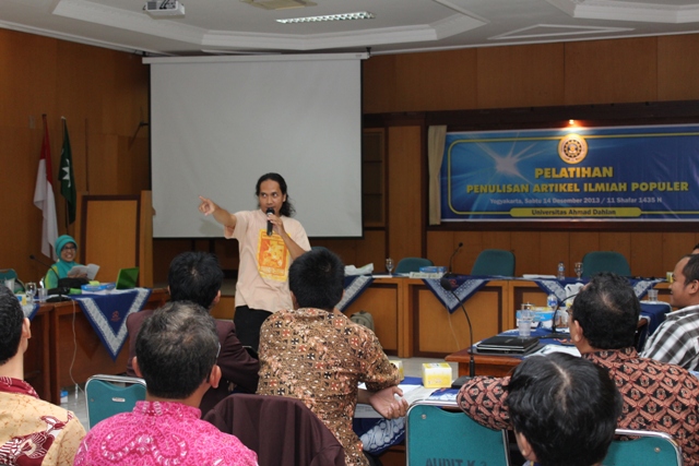 Universitas Ahmad Dahlan (UAD) mengadakan pelatihan menulis artikel ilmiah popular untuk dosen. Para dosen sudah terbiasa menulis jurnal ilmiah tingkat nasional dan internasional, namun penulisan artikel ilmiah popular masihlah sedikit.“Padahal dibutuhkan penyebaran ilmu pengetahuan sesuai dengan keilmuan masing-masing. Tentu saja dengan bahasa yang lebih ringan dan dapat dipahami segala lapisan masyarakat,” ungkap Wakil Rektor 1, Dr. Muchlas, M.T. dalam sambutan pembukaan acara di hari Sabtu (14/12).