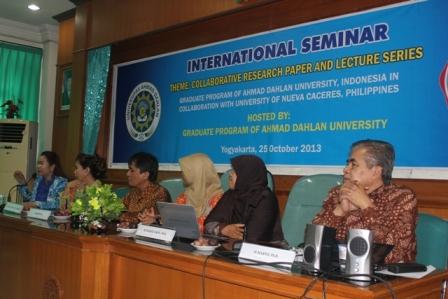 Jum’at, 25 Oktober 2013, Pascasarjana UAD, bekerjasama dengan Pascasarjana University of Nueva Caceres (UNC) Filipina (Philippina/Philippines), menyelenggarakan Collaborative Research Paper and Lecture Series. Bertempat di ruang sidang kampus 2 UAD, kegiatan ini merupakan salah satu bentuk realisasi MoU yang telah ditandatangani UAD dan UNC sejak tahun 2010. Kegiatan ini dibagi menjadi dua sesi yaitu sesi pagi research paper presentation dan sesi siang lecture series. Dalam research paper presentation, dipresentasikan 5 research paper, 3 dari dosen UAD dan 2 dari dosen UNC.